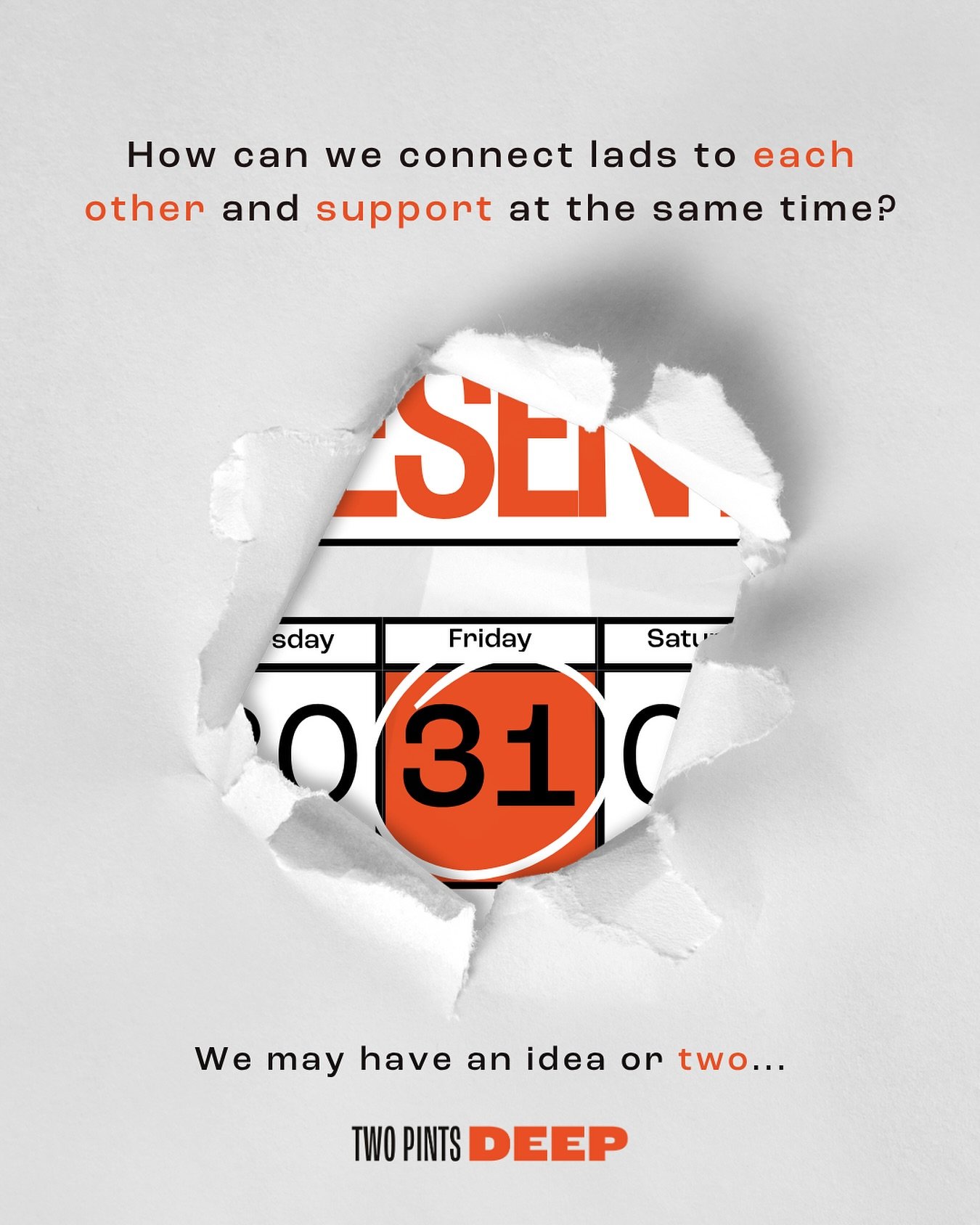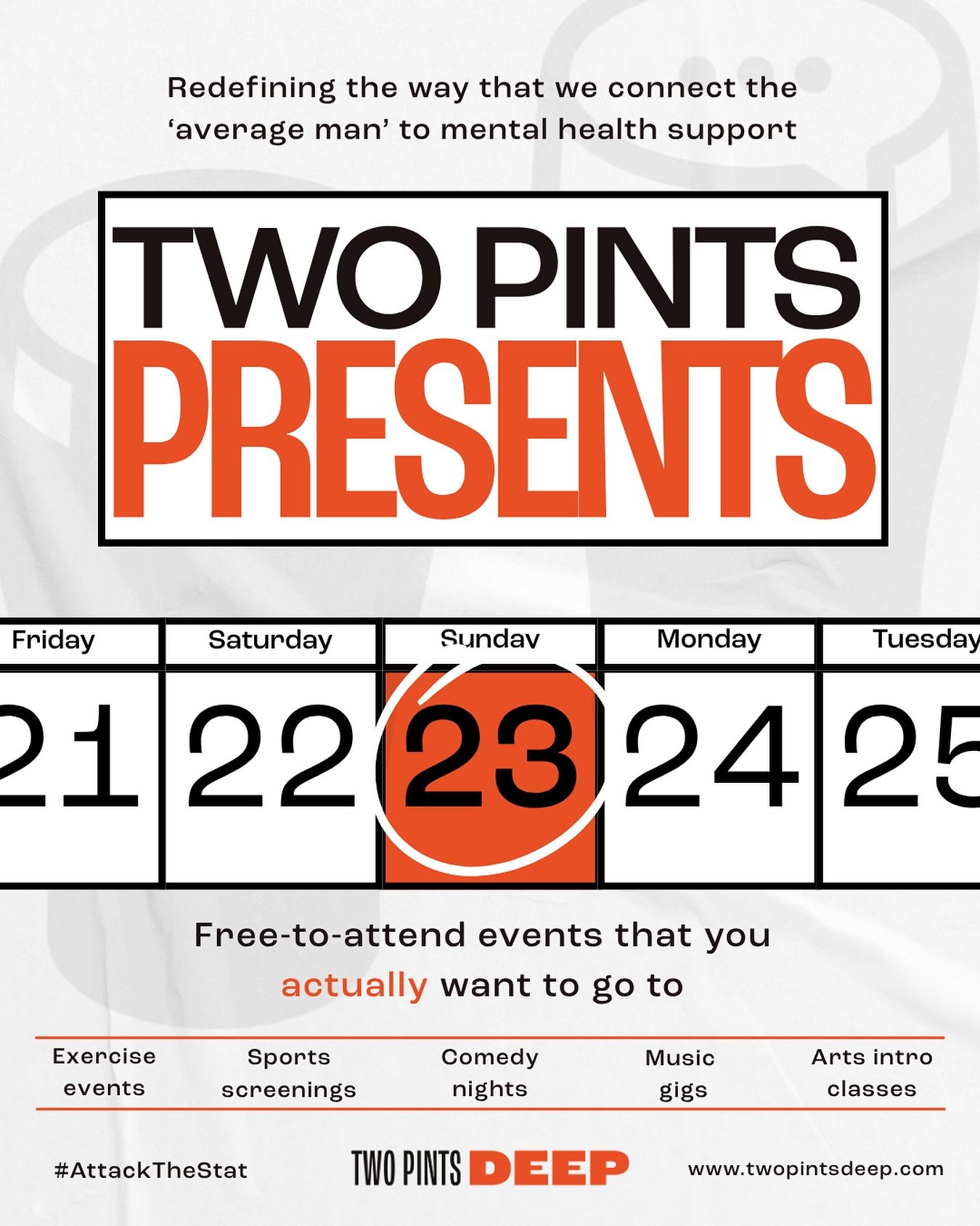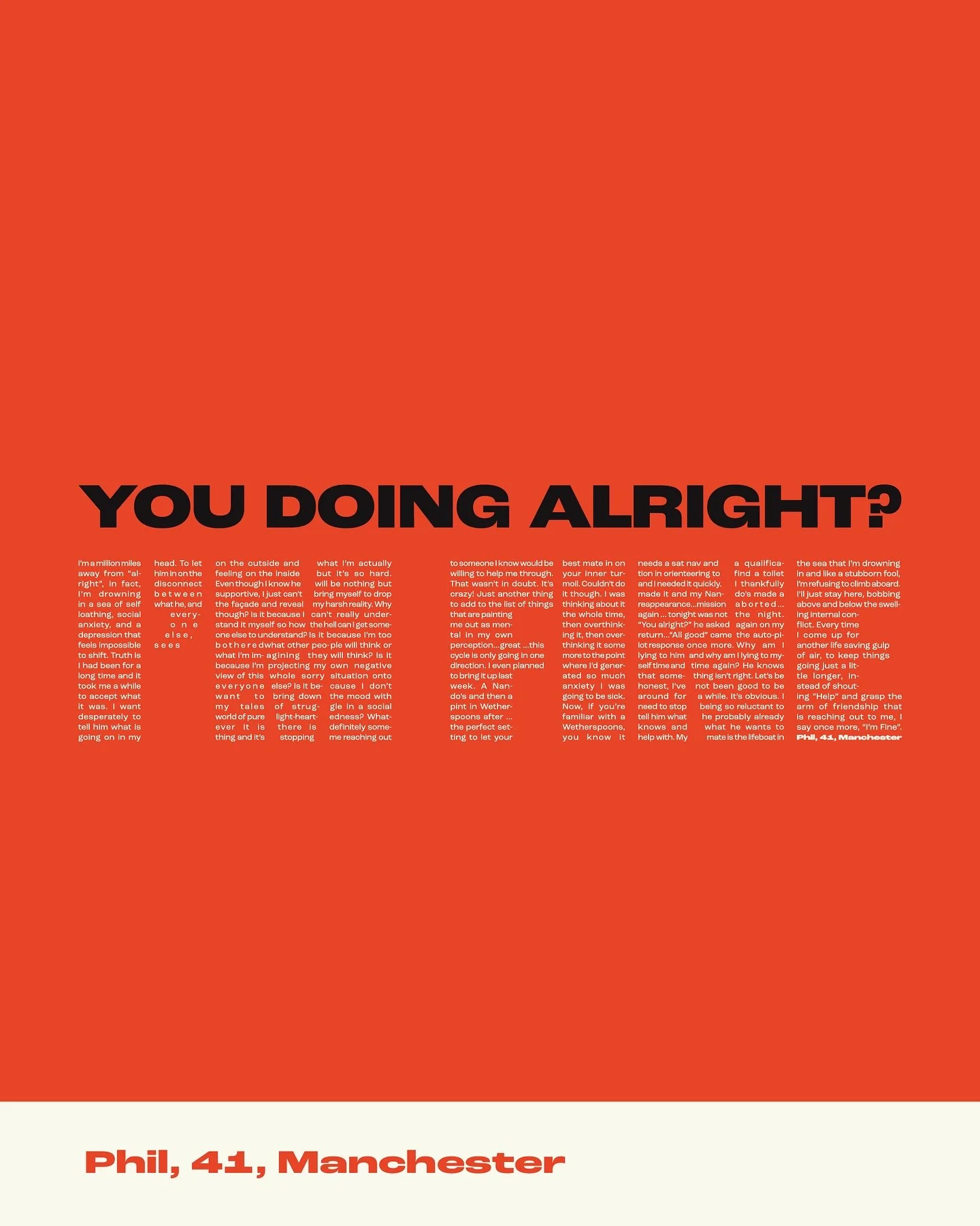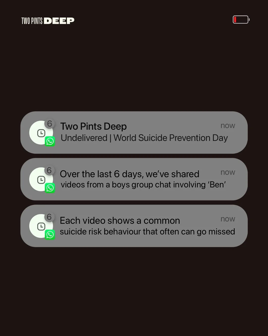 WE’RE LOSING TOO MANY MEN. AN AVERAGE OF 13 MEN DIE BY SUICIDE EVERY SINGLE DAY IN THE UK. IT’S THE LIKELIEST WAY WE’LL DIE UNTIL WE’RE 55. IT’S TIME TO ATTACK THAT STAT. IT’S TIME TO ATTACK IT, TOGETHER.